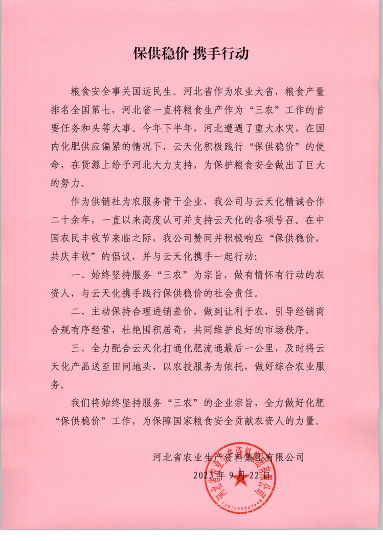 作為供銷社為農(nóng)服務(wù)骨干企業(yè),我公司與云天化精誠合作二十余年,一直以來高度認可并支持云天化的各項號召。在中國農(nóng)民豐收節(jié)來臨之際,我公司贊同并積極響應(yīng)“保供穩(wěn)價,共慶豐收”的倡議,并與云天化攜手一起行動,我們將始終堅持服務(wù)“三農(nóng)”的企業(yè)宗旨,全力做好化肥“保供穩(wěn)價”工作,為保障國家糧食安全貢獻農(nóng)資人的力量。