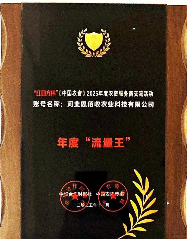 ? 同日,由中華合作時報社、中國農(nóng)資傳媒主辦的“‘紅四方杯’尋找流量王 ·《中國農(nóng)資》2025年度農(nóng)資服務(wù)商交流活動暨《國肥之光第二季》”在南京舉行。會上發(fā)布了2024-2025年度農(nóng)資服務(wù)商典范企業(yè)名單及年度“流量王”名單,集團(tuán)公司榮獲“農(nóng)資保供典范企業(yè)”榮譽(yù)稱號,旗下河北思佰收農(nóng)業(yè)科技有限公司視頻號榮獲年度“流量王”榮譽(yù)稱號。