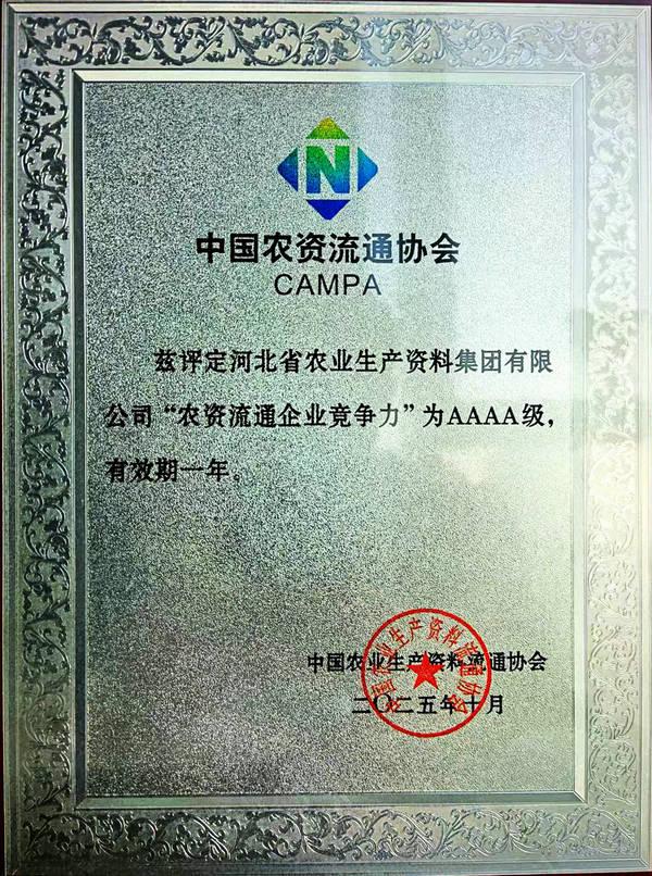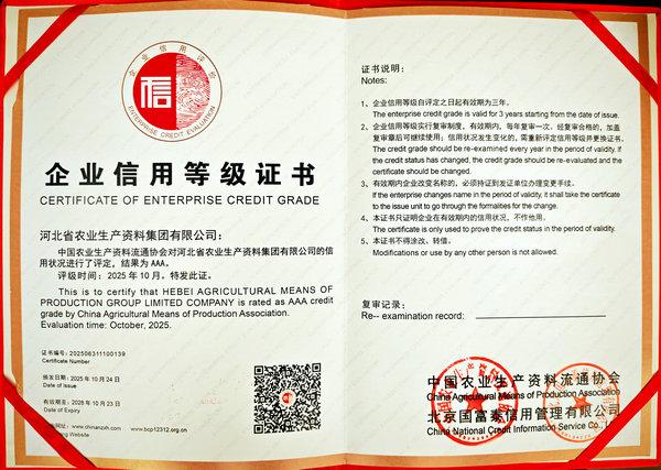 本網(wǎng)訊 11月4日,中國農(nóng)業(yè)生產(chǎn)資料流通協(xié)會在江蘇省南京市召開“2025年度中國農(nóng)資經(jīng)銷商年會”。會上發(fā)布了“2024/2025中國農(nóng)資流通行業(yè)發(fā)展報告”,公布了2025年度中國農(nóng)資流通企業(yè)信用等級評價結(jié)果、2025年度農(nóng)資流通企業(yè)競爭力評價及農(nóng)資行業(yè)知名品牌認(rèn)定結(jié)果。集團(tuán)公司被評為“AAA級信用企業(yè)”,同時榮獲“2025年度農(nóng)資流通企業(yè)競爭力AAAA級”,“冀農(nóng)”品牌被評為‘“AAA”級農(nóng)資行業(yè)知名品牌(產(chǎn)品類)。
